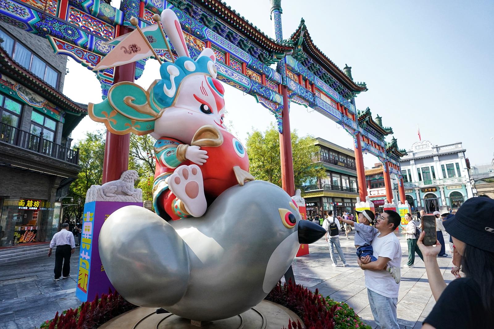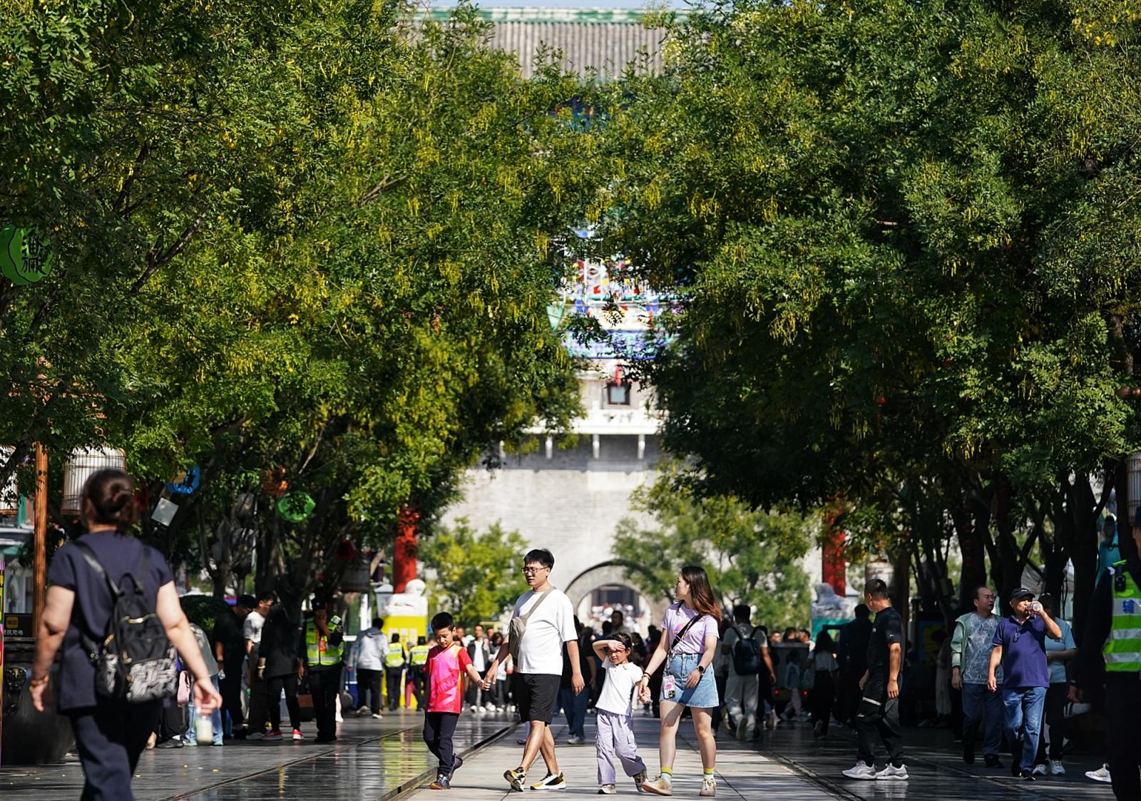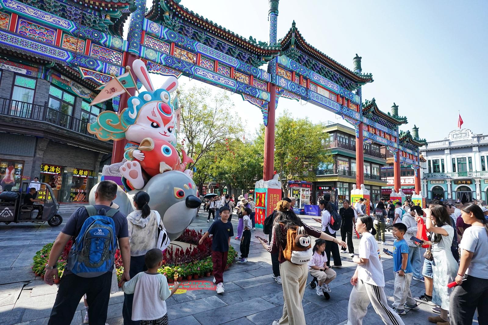 国庆假期第二天,市民与游客走进北京前门商业步行街,在逛潮闪节、游中轴线的沉浸式体验中,解锁双节假期的别样乐趣。