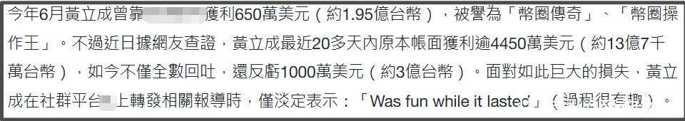 不管怎么算,都是很大一笔钱呀,报道一出,黄立成本人通过社媒做出回应,他说:“Was fun while it lasted”,意思是过程很有趣,看着挺淡定的,只是网友想法不同。