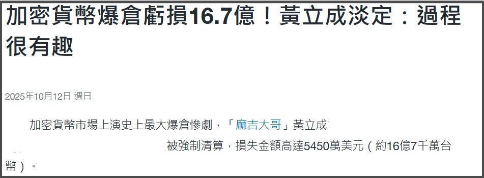 关于黄立成的资产,各种说法都有,一直是一个谜,台媒帮他算了一笔账,2025年10月,黄立成一口气赔掉了5450万美元,约合3.8亿人民币,折合成台币是16.7亿。