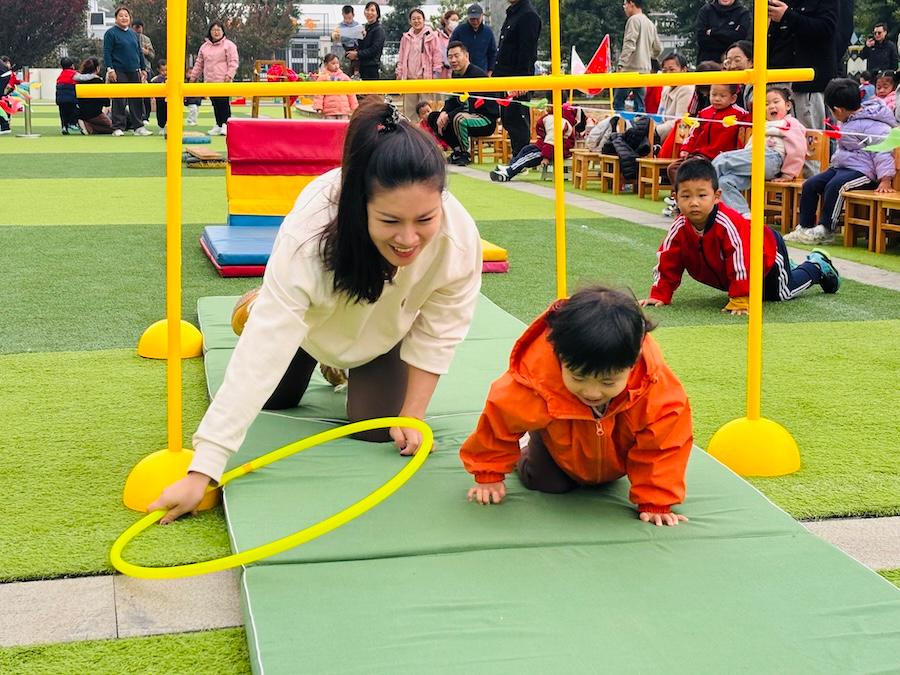 小班“亲子运动会”是爱的互动主场。家长们放下繁忙,化身孩子的“最佳队友”,与宝贝们共同完成“趣味接力”“亲子运球”等游戏。小小的身影在家长怀中穿梭,清脆的笑声与加油声交织,每一个合作瞬间都充满温情,不仅锻炼了孩子的肢体协调性,更拉近了亲子距离。